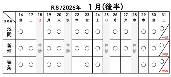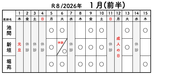 2025年12月13日 / 最終更新日時 : 2025年12月13日 jinon-clinic お知らせ ❖令和8年(2026年)1月 診療体制について❖ ■休診 毎週水曜日 1日(木): 元旦 2日(金)〜3日(土): 年始休 12日(月): 成人の日 ■診察担当表 ※ 学会参加や手術対応、流行性感染症の感染防止等のため担当変更や臨時休診となる場合があります。 くわしくはお電話でご確認ください。 ・カレンダーをクリックすると拡大できます。