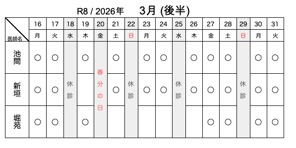 2026年2月2日 / 最終更新日時 : 2026年2月2日 jinon-clinic お知らせ ❖ 令和8年(2026年)3月診療体制について ❖ ■休診 毎週水曜日 20日(金): 春分の日 ■診察担当表 ※ 学会参加や手術対応、流行性感染症の感染防止等のため担当変更や臨時休診となる場合があります。 くわしくはお電話でご確認ください。 ・カレンダーをクリックすると拡大できます。